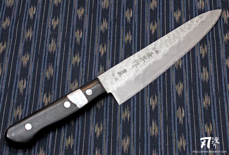 Kengata gyūtō variant is actually often called “kiritsuke gyūtō”. Outside of Japan this type is even often presented as a kiritsuke knife, which is a totally misleading statement – a true kiritsuke is always a single bevel knife, not a double bevel knife. Thus the correct way to call this type is “kiritsuke gyūtō” or “kengata gyūtō” (literally means “sword type gyūtō”).