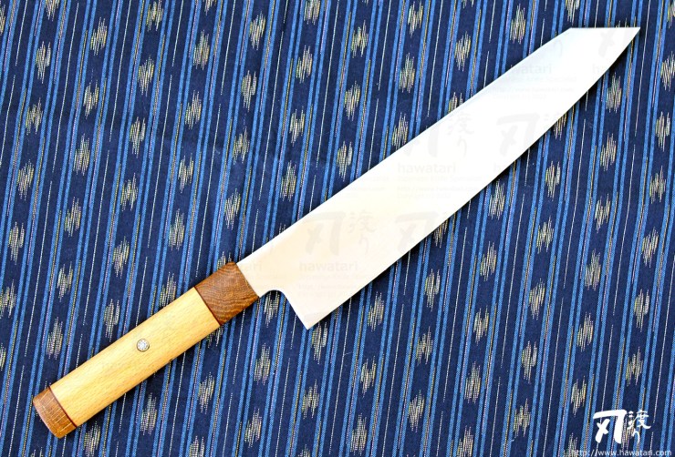 Gyūtō knife with a sword-like tip. This variant is a fairly modern version of the classical gyūtō, and it has spawned quite recently, because this kind of geometry has gained huge popularity among foreign based users. The geometry of this blade is closely mimicking the geometry of a “kiritsuke” 切付包丁- a single bevel knife for professionals, that is developed as a crossover between yanagiba and usuba knives.