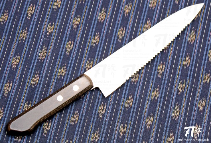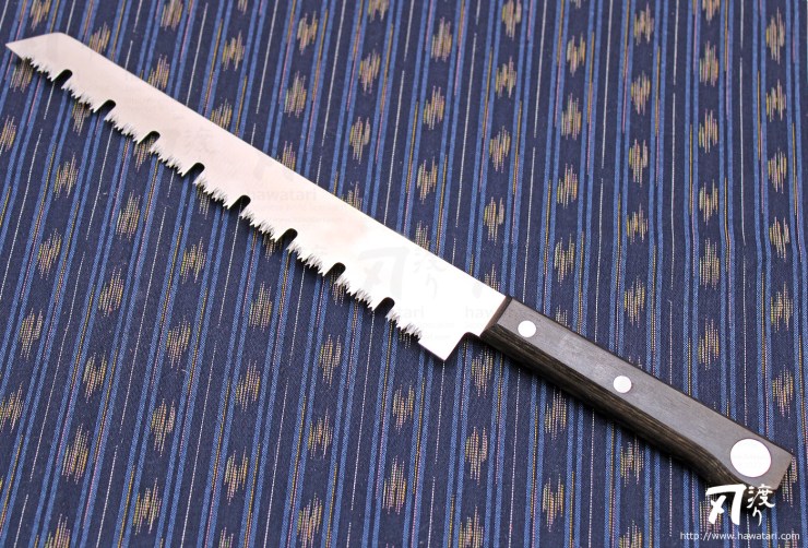 Special frozen food knife, designed for processing frozen meat. Is equipped with less aggressive teeth and has sharp edge areas at the tip and the heel. Blade profile is similar to gyuto profile.
