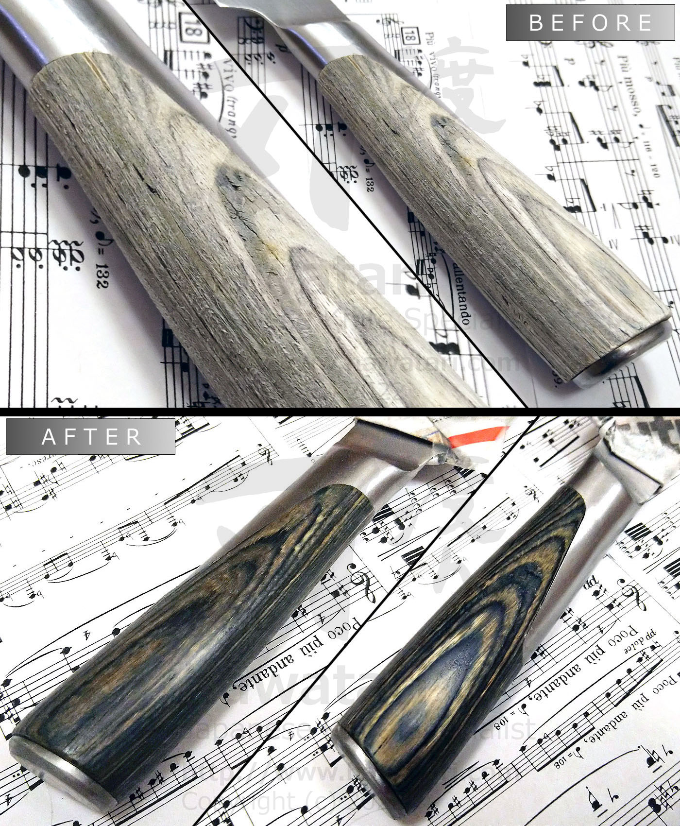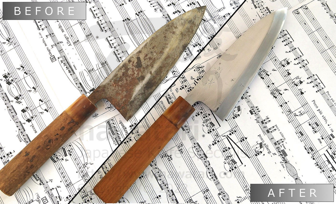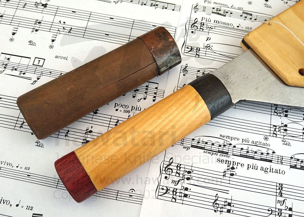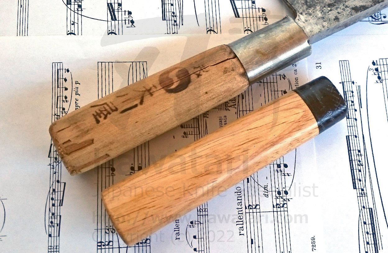 We provide handle refurbishment service as well, for both Japanese and Western type handles. We can also, per request, handcraft a new handle for your knife (both Japanese and Western type). More information on our handle replacement service can be found in the handle replacement section.