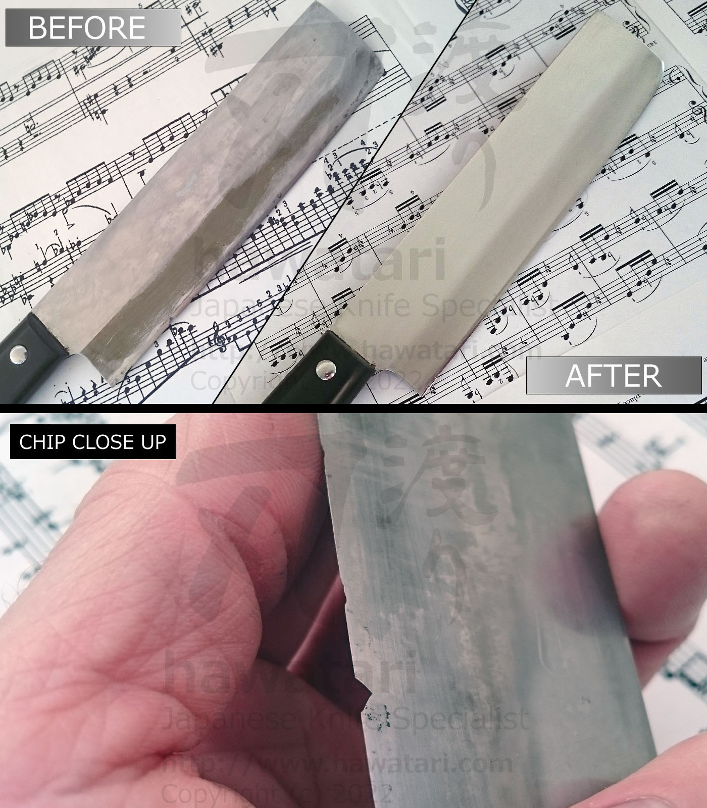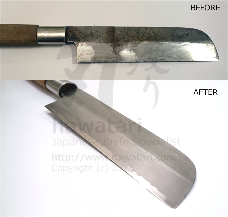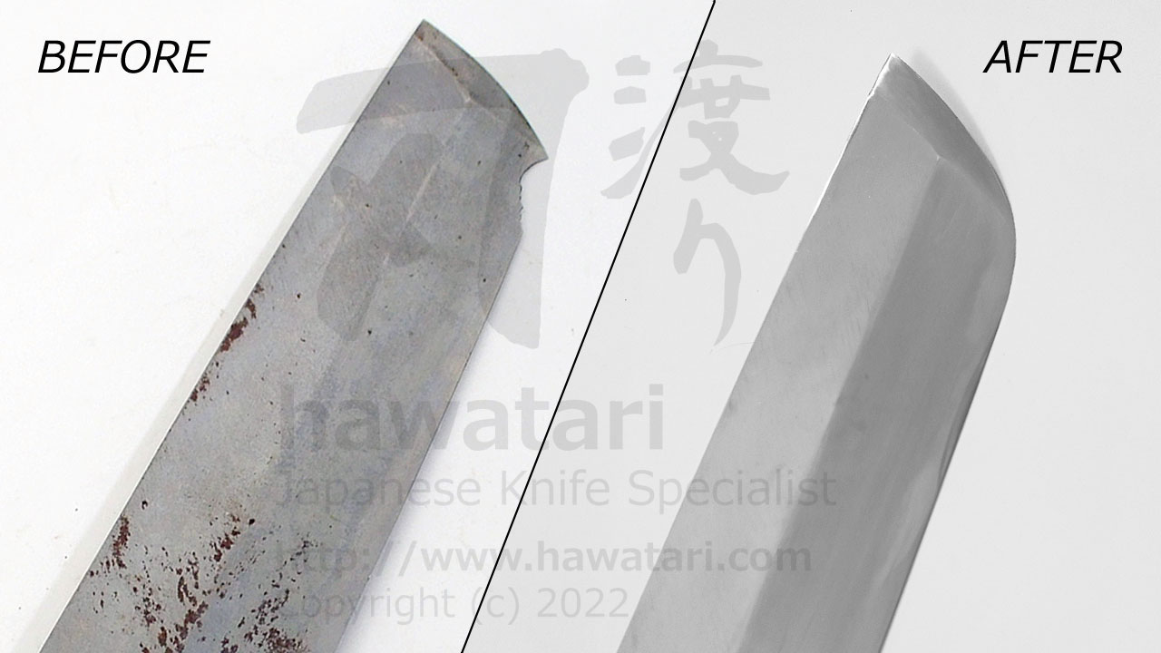 Over the years we at hawatari have gathered great experience in restoring knives to new-like condition. We can repair chips (regardless of their size), broken tips, correct damaged blade geometry, remove rust and polish the steel to a new-like look. Knife repair service that hawatari offers are of the highest quality and are performed in accordance with traditional Japanese methods.